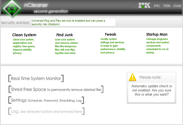 nCleaner es la aplicación más liviana de todos, con tan solo 875 kb de tamaño permite gestionar el arranque de Windows, recolección de archivos basura, monitor de recursos del sistema, optimización de la memoria, administración de las opciones de Windows, entre otras.